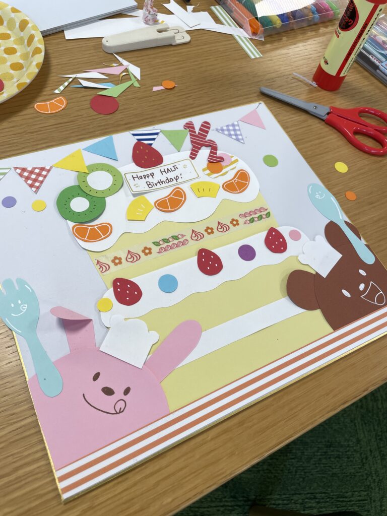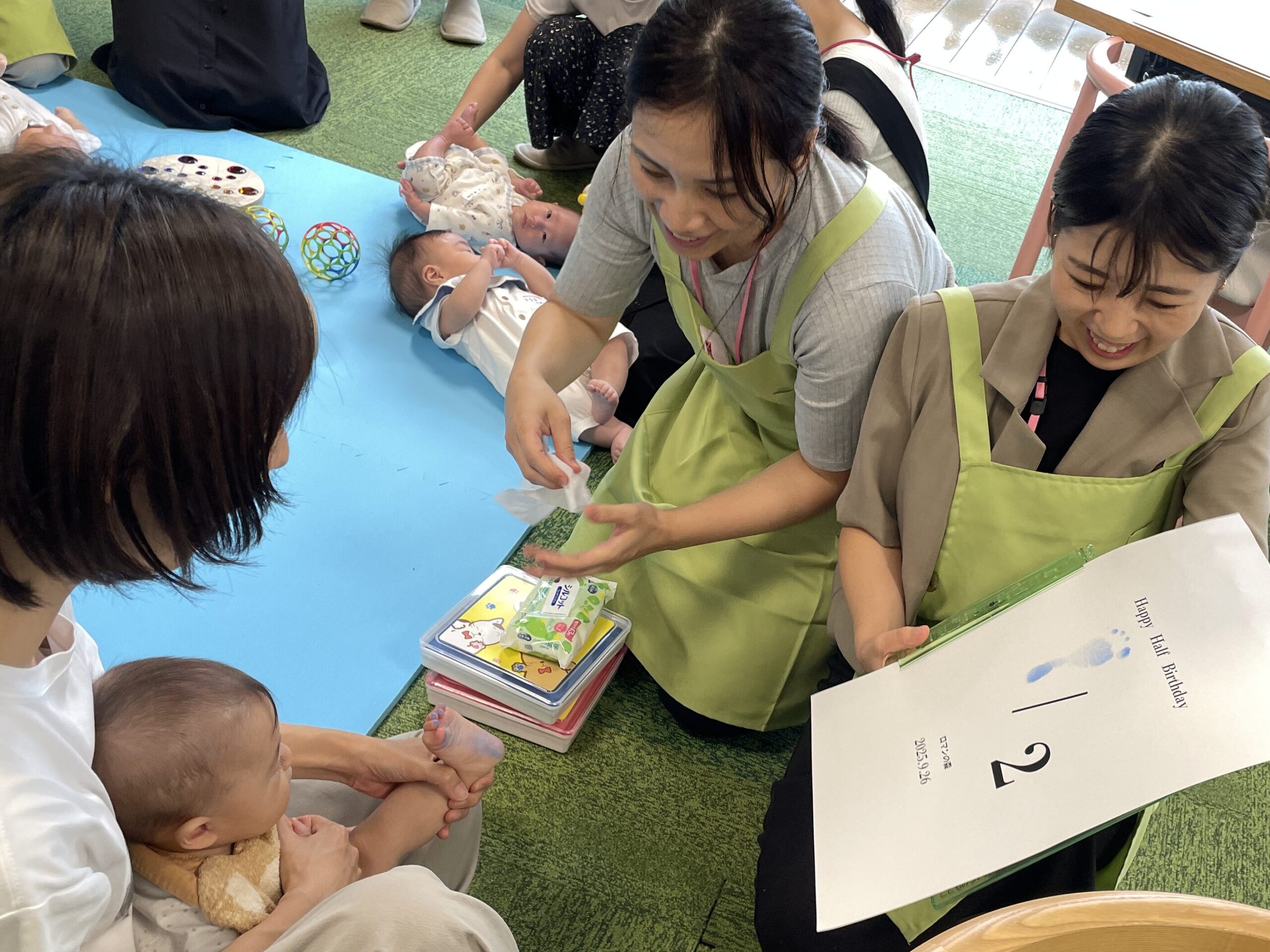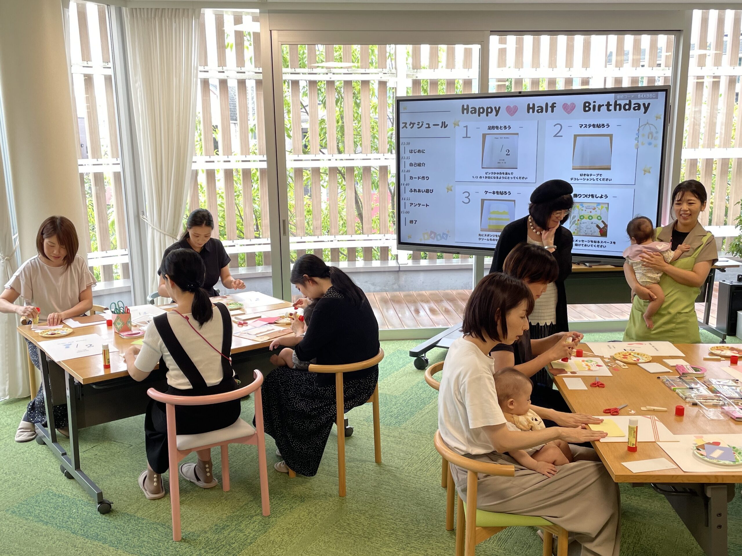 生後2~6ヶ月の乳児とお母様8組が参加し、お子様の6ヶ月を祝う記念カードを制作。バースデーケーキやフルーツなどの切り絵を色紙に自由に貼り付け、カラフルにデコレーション。その間、お子様はマットで遊んだり、抱っこされながら一緒に制作に加わったりと自由に楽しまれ、時には可愛らしい泣き声も。お子様の成長をともにお祝いできる温かい雰囲気に包まれた時間となりました。なお、本イベントは2026年2月にも再び実施を予定しております。